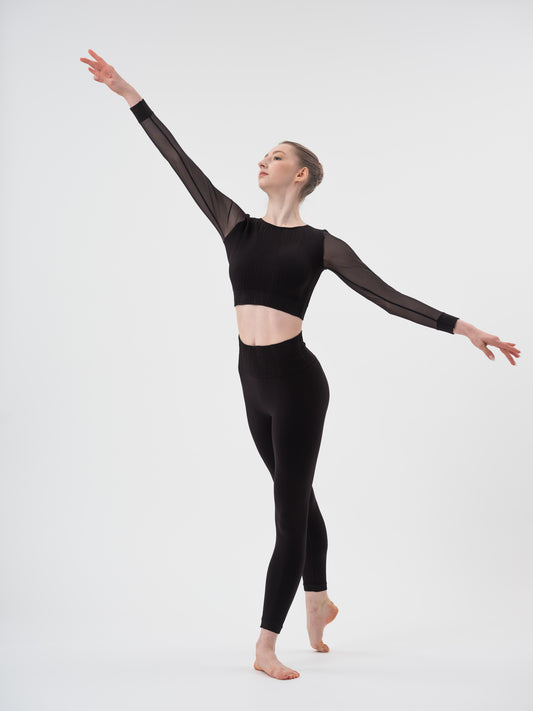 Crop top de danse manches longues PriDance – Sans couture, tulle transparent, noir (180)